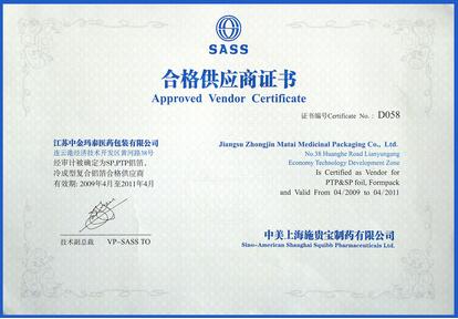 近日,我公司被中美上海施貴寶制藥有限公司評為2009-2011年度合格供應商,并頒發證書。