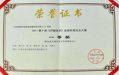 2012年1月,由本公司周立軍、伏陽(yáng)、陳慶文、陳強(qiáng)、吳新上等五位科技人員撰寫的論文《水性材料開啟藥品泡罩包裝環(huán)保之門》榮獲2011第十屆《印刷技術(shù)》全國(guó)有獎(jiǎng)?wù)魑拇筚愐坏泉?jiǎng)。 軟包裝無(wú)苯化已成為不可逆轉(zhuǎn)的潮流。這篇論文是上述科技人員在本公司實(shí)行無(wú)苯化進(jìn)程中的獨(dú)到見解和心得體會(huì),深受專家評(píng)委好評(píng)。本篇論文是該主題全國(guó)唯一的一個(gè)一等獎(jiǎng)。