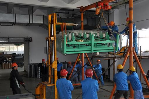 4月1日上午,在公司二工廠的廠房外圍,一臺龐大的起重機正吊起一臺設備組件往廠房二樓窗口支架的方向緩緩移動,在現場施工負責人的指揮下,設備穩穩地降落在支架的平臺上,而此時在9米高支架平臺處的設備部經理朱永希則帶領其他人員將設備緩緩地往廠房內的平臺處移動……